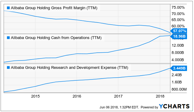 有人指出阿里最近出现了毛利率下滑的问题。值得注意的是,随着阿里实行线上到线下的战略,保证物流基础设施的安全,公司的毛利率会承压是可以预料的。尽管毛利率下滑,但好在阿里过去十二个月的营运现金流持续增加。这使得阿里能维持用于研发的不断增长的投资,而这些投资是维持公司领导地位的必要开支。