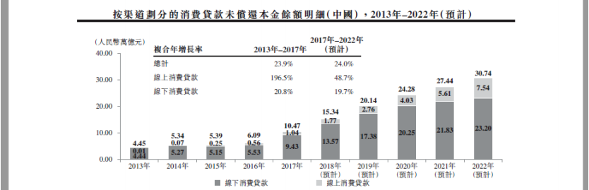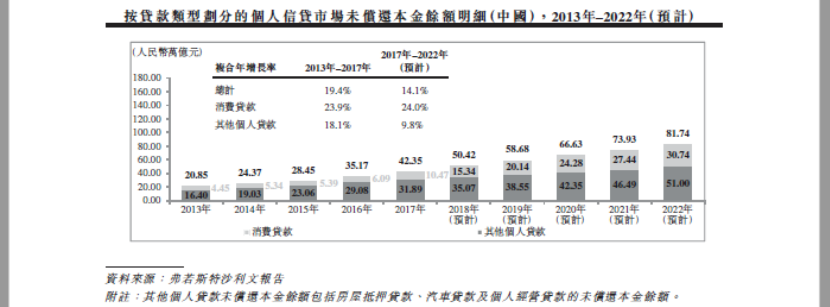 根据弗若斯特沙利文报告,消费贷款的未偿还本金余额由2013年至2017年按23.9%的复合年增长率增长,超过其他个人贷款于同期内的18.1%增长率。消费贷款的未偿还本金余额预计于2017年至2022年将继续24.0%的复合年增长率增长,将继续超过其他个人贷款于同期9.8%的增长率。