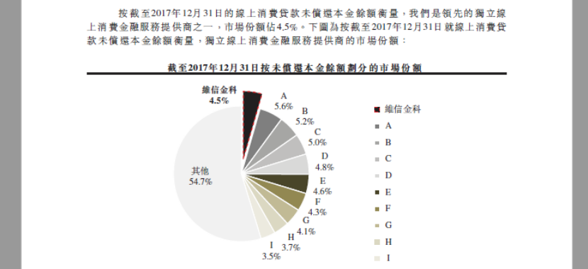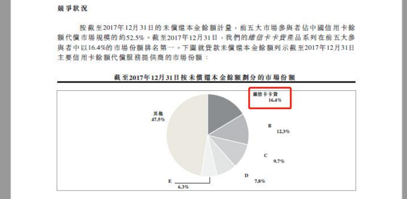 根据弗若斯特沙利文报告,以贷款未偿还本金余额计,截至2017年12月31日,公司是中国排名前10的独立在线消费金融服务提供商之一,维信卡卡贷产品系列在中国的信用卡余额代偿市场排名第一,约占16.4%的市场份额。用户为通常持有银行账户及信用卡但未得到传统金融机构充分服务的人群。