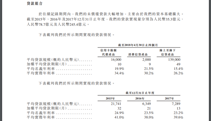 3. 线上+线下贷款。现金贷业务,在online申请,offline验证身份,贷款规模比较大,均值达到14W。比其他两块大很多,这一部分收入占比达到41%,主要的在线至线下信贷产品品牌包括贷贷看。提供的多数在线至线下信贷产品为6至60个月的分期产品。就2018年1月至4月实现的在线至线下信贷产品贷款而言,加权平均期限为约49个月,平均贷款规模约为人民币139,000元,平均名义年利率及平均实际年利率分别为约15.4%及约26.2%。