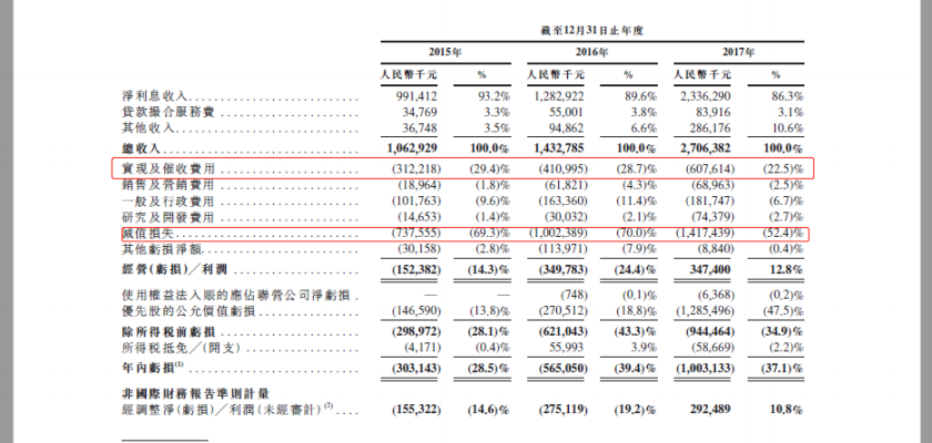 维信金科的营收增长非常迅速,同时随着业务转移,现金贷比重逐步降低,新的信用卡和消费贷业务更加突出,预计未来依然可以维持告诉增长。但是成本端是否能节约更多空间,现在不得而知。招股书没有披露减值损失的具体来源,如果以常识判断,现金贷业务更能会出现较多的减值损失。信用卡和消费贷的稳定性相对较好,那么公司未来如果在这两方面营收继续发力,成本端的最大部分有望继续缩减。