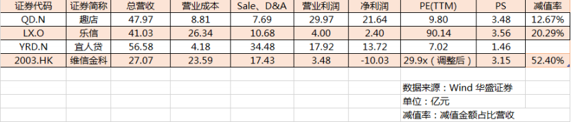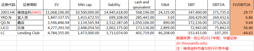 如果我们使用EV/EBITDA估值方式,维信金科达到29.77倍,比趣店和宜人贷要很多,相比乐信56倍要低。