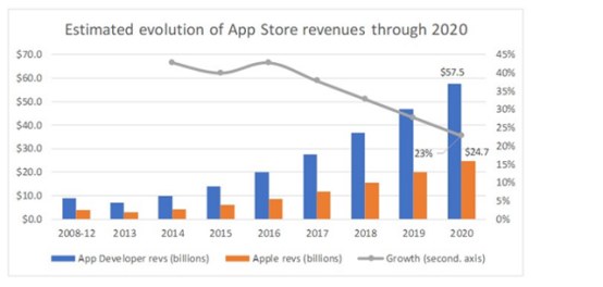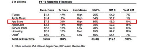 正如下面的表格所显示的那样,应用商店的利润率已经达到了85%,这一数字对于苹果公司的利润来说意义重大。假设这个利润率是准确并且稳定的,仅2020年应用商店业务将产生168亿美元的净收益,再假设没有额外的运营费用和20%的有效税率,那么相当于苹果在上一个的财政年度的净利润总额的三分之一。据笔者估计,App Store的收益增长将与2017年的总销售额增长大致相当,以美元(不考虑汇率影响)计算。