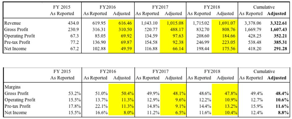 1)2016财年到2018财年,预计公司虚增运营利润至少21.6%,税前利润39.8%,净利润至少43.6%;