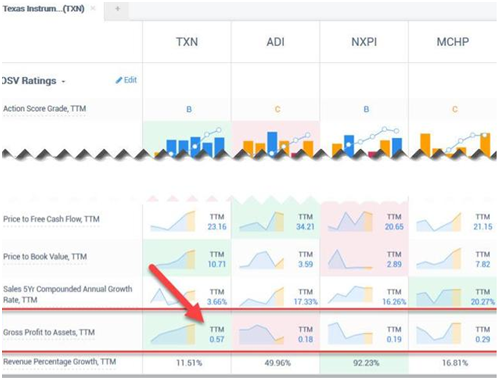 公司营收5年复合增长率为3.7%,毛利与资产之比GPA为0.57,通过与行业竞争者的对比,可以明显看出公司的盈利能力是多么的强悍。下图中的恩智浦、亚德诺、微芯科技的GPA均远远落后于德州电子。