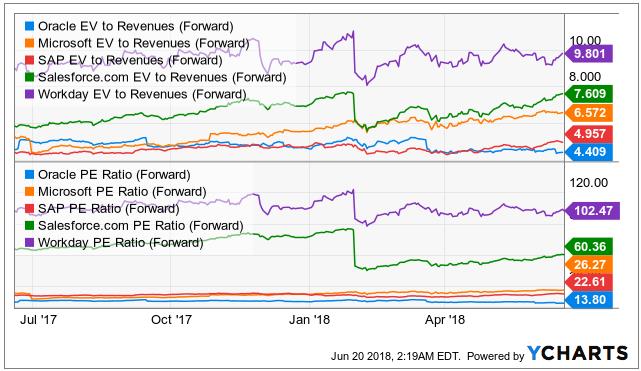 甲骨文目前是五大软件巨头中估值最低的公司。甲骨文目前市盈率不足14,仅为微软市盈率的一半,同时远低于大盘。此外,公司预计未来一年的每股收益将实现两位数增长。低估值和高增速的预期使甲骨文十分具有吸引力。