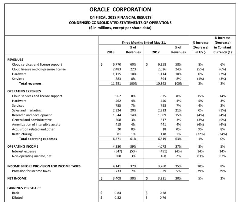 甲骨文(NYSE: ORCL)昨日公布了截至5月31日的2018财年第四季度财报。尽管甲骨文四季度的营收和利润都超过华尔街预期,但公司股价在财报公布后下跌,这种情况已是连续第三个月出现。