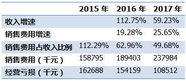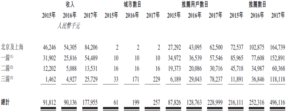 公司业务主要侧重于一线市场,但是随着城镇化的推动,三线城市的迅速发展,公司渠道不断下沉,加大对三线城市的扩张,相应收入从2015年的1.46万元,到2016年增长为492.7万元,2017年迅速扩大为2572.9万元,量级指数级增长。