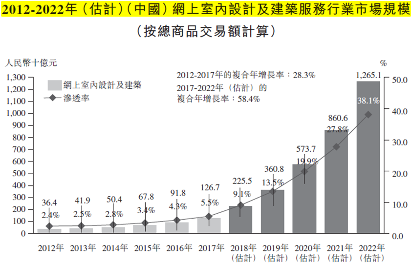 得益于互联网的普及、科技的进步以及用户喜欢在网上搜索室内装修解决方案的偏好性,我国网上家装行业市场迅速发展,其市场规模从2012-2017年复合增长率达到28.3%,关键在于2017年互联网渗透率仅为5.5%,具备明显的高增长潜力,预计我国互联网家装市场规模在2022年将达到12651亿元,年复合增长率达到58.4%,其互联网渗透率达到38.1%。