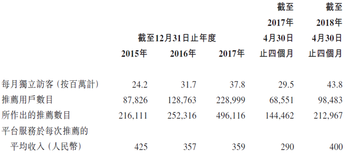 2015-2017年,公司平台每月分别拥有2420万名、3170万名、3780万名独立访客,虽然公司的月活、注册用户以及GMV和每月付费用户并不与公司平台业务收入直接相关,但是公司平台用户数据的不断扩大,从侧面显示公司的市场知名度,以及公司未来能够获得更多的供应商,提供多样化的服务,满足用户需求,从而获得吸引更多的用户流量,达成良性循环。
