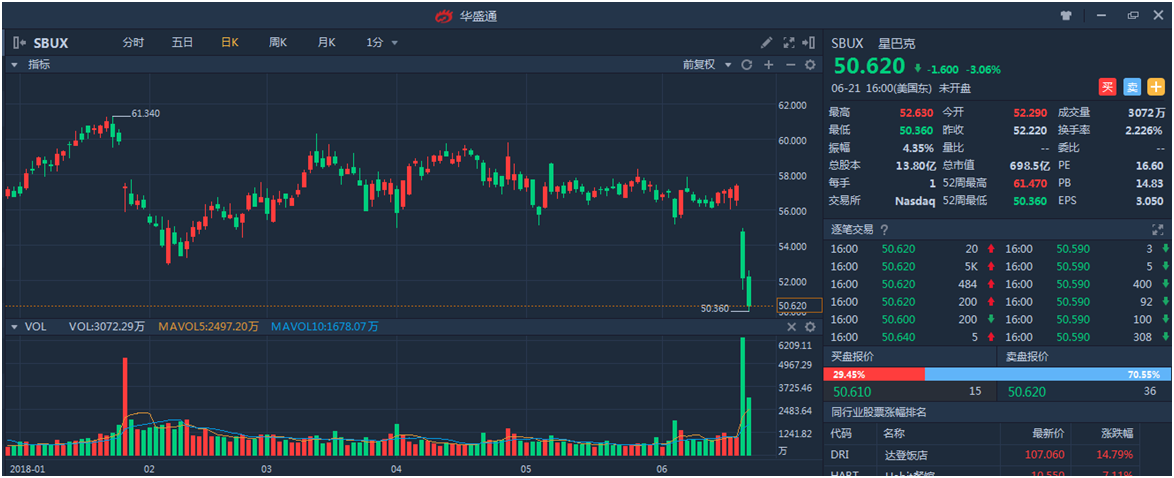 由于公司糟糕的业绩预期,美国咖啡连锁巨头星巴克股价接连跳水,自周三大跌9.07%之后,昨晚再次下跌3.06%,股价达到50.62美元,创一年半以来新低。