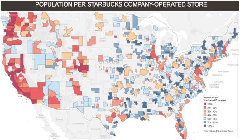 有研究报告显示,2012年和2014年,美国平均方圆一英里范围内分别有3.2家和3.3家星巴克咖啡店,随着过去三年公司的快速扩展,在美国开设了2000家新店,截止2017年8月,这一数据变成了3.6家。
