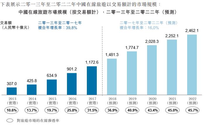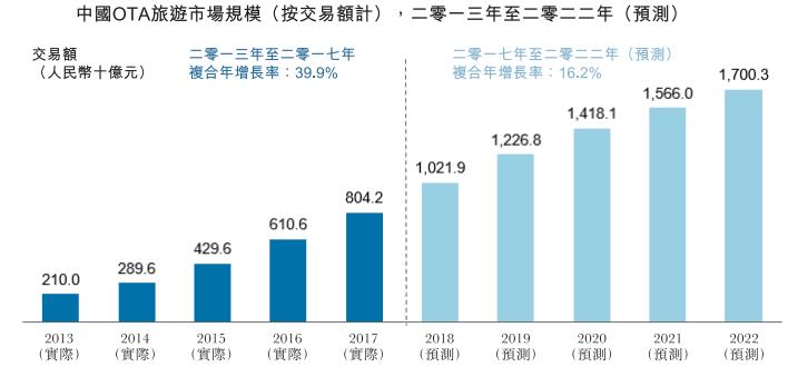 中国的在线旅游市场规模庞大,且目前正处于快速发展阶段。按总交易额计,中国在线旅游市场规模从2013年的3070亿元人民币增长到2017年的约1.17万亿元人民币,期间的符合年增速高达39.8%。预计2022年该市场规模将增长至约2.46万亿元人民币。多年来,中国旅游市场的线上渗透率不断提升,但相比美国等发达国家仍有差距,因此预计未来还有不少增长空间。