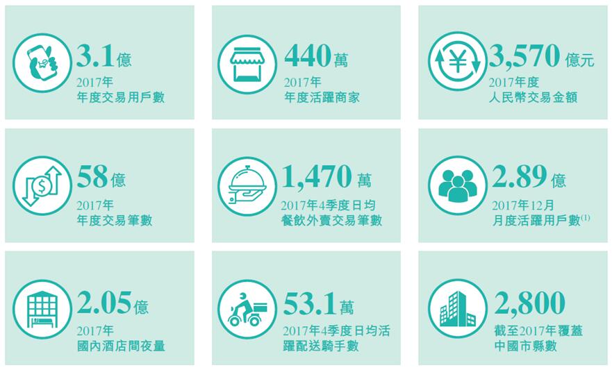 2017年公司完成交易笔数超过58亿,交易金额达3570亿元,年度交易用户约3.1亿,年度活跃商家440万家,遍布国内2800个城市。