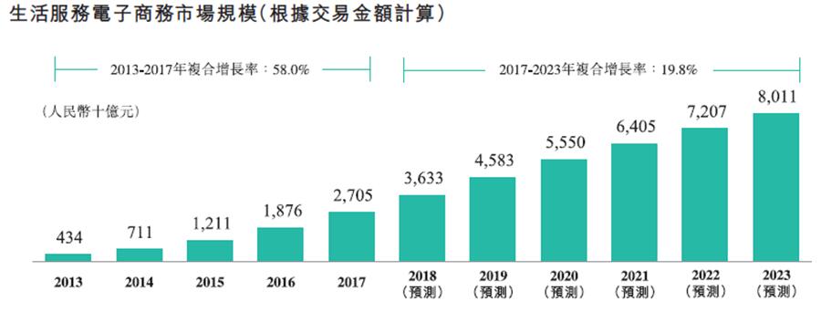 根据艾瑞网的预计,国内生活服务行业规模预计将从2017年的18.4万亿元增长到2023年的33.1万亿元,年复合增长10.2%。而生活服务电子商务行业的规模同期将从2.7万亿元增长到8万亿元,年复合增长19.8%。
