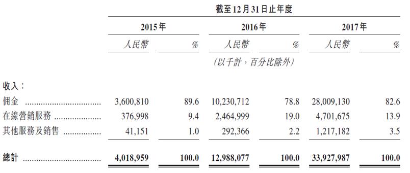 从收入来源方式看,佣金一直是主要的收入来源。佣金一般按照交易价值的百分百收取。公司平台交易总量从2015年的1610亿元增加到2016年的2370亿元,并进一步增至2017年的3570亿元,同比增长率保持在50%左右。