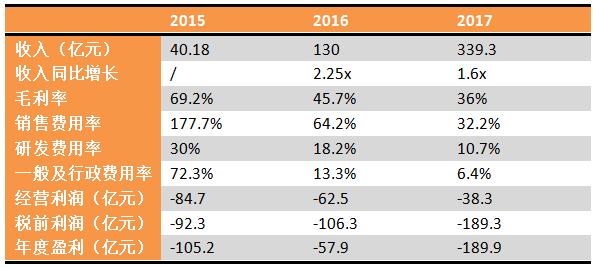 收入高速增长的同时,三费有所下降。公司销售相关费用占比从2015年的177.7%降至2017年的32.2%,显示出巨大的规模效应;研发费用和行政费用也都大幅下降。