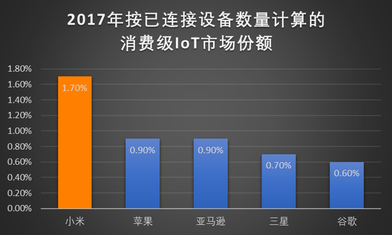 2、率先形成物联网时代的网络效应:物联网同PC互联网和移动互联网时代一样,具备非常明显网络效应,节点数的增加会导致网络的价值更快速的增长,不一样的在于这个节点由人变成了物。目前小米通过早期的生态链布局,其消费级物联网平台接入数(截至0218Q1,达1亿台)居于全球第一,领先于对手实现了物联网平台的初步搭建。