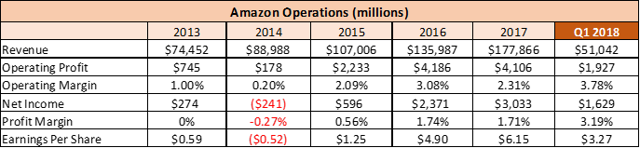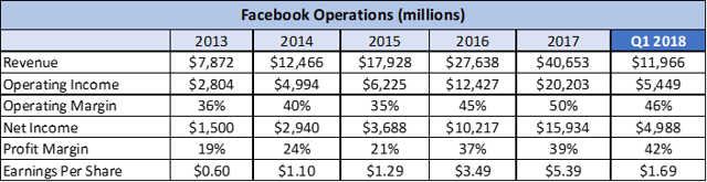 Facebook的收入虽然显著减少,但营业利润率更高了。2017年,Facebook营业利润202亿美元,而亚马逊的营业利润仅41亿美元。要知道,亚马逊的企业价值更高(8520亿美元vs Facebook的5230亿美元),所以Facebook的高营业利润率比只看数字本身更重要。 Facebook 2017年营收增长了47%,也比亚马逊的31%高。