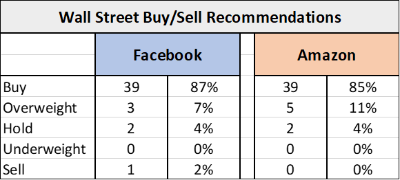 华尔街在Facebook和亚马逊上的评级非常相似,给出的目标价格隐含的上涨空间也差不多。根据MarketWatch的数据,Facebook的平均目标价为221.32美元,相当于目前196美元的股价空间在12.7%左右;亚马逊的平均目标价格为1,885美元,相当于目前1663美元的股价空间13%。