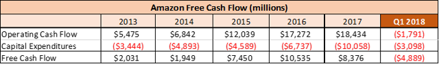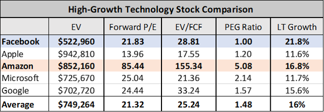 如果以上还不能很好地区别开Facebook和亚马逊,那么在比较估值时就会变得很清楚。购买Facebook,你可以获得类似的增长率,但估值明显更便宜。鉴于PEG比率仅为1倍,Facebook相对于其他高增长科技公司而言看起来也相对便宜。笔者经常质疑亚马逊的估值具有高度投机性,并且基于该公司未来5到10年可能无法实现的业绩。例如,亚马逊的EV / FCF为25x,它需要产生340亿美元的自由现金流,这种情况不会长期持续。