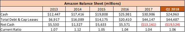 两家公司资产负债表都很健康,但Facebook的情况要好得多。 Facebook已经建立起一个小金库,没有债务。笔者认为Facebook是少数几家在未来十年有能力收购苹果的公司之一(只考虑现金能力,不考虑实际可能)。亚马逊由于收购Whole Foods和其他投资,2017年公司拟债务大幅增加,虽然相对于企业价值,440亿美元的债务仍然微不足道,但债务增长的速度可能会在未来引起一些担忧。