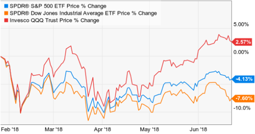 虽然美国与全球贸易合作伙伴经历了多次谈判,但是如何保证美国的利益,各国及贸易组织的进出口关税等影响,市场依然十分担忧贸易战的升级。从进入2018年以来,贸易战就挑拨着市场的神经,但是值得注意的是,虽然也收到整体市场情绪的影响,但以科技股为首的纳斯达克指数,其表现较道指和标普相对较好。