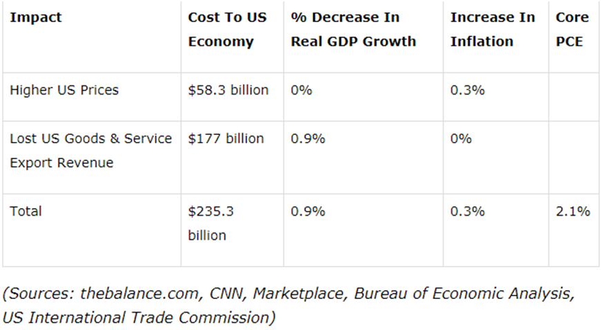 真正的贸易战一定会对美国经济造成巨大的损失,高昂的物价将对美国经济造成583亿美元的损失,出口的损失将达到1770亿美元,仅此两项就将导致美国真实GDP增长率下降0.9%,通货膨胀的抬高,更会减慢美国经济的增长。