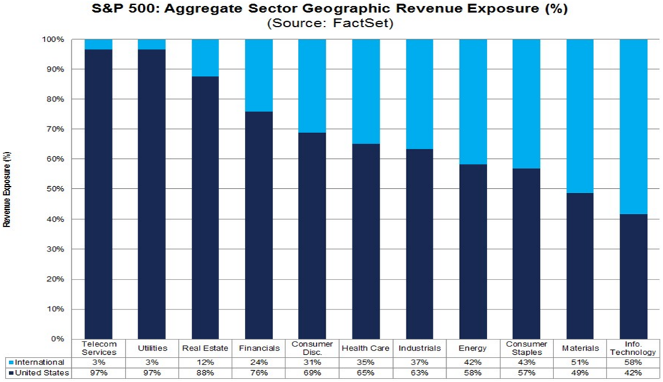 分行业来看,信息技术、能源、工业制造等行业,其海外收入占比较高;而电信服务、公共服务及房地产等行业,其收入主要来源自美国本土。