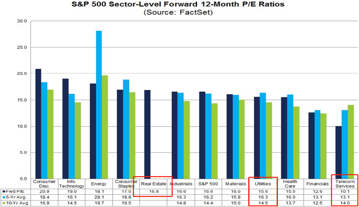 另一方面,投资者也可以将资金配置到贸易战影响较小的行业,例如上文所讲的电信、公共服务、房地产行业。而且通过对比行业远期市盈率,以上三个行业估值相比其他行业并不高。