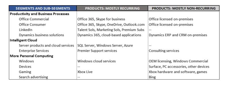 对微软的了解越多,就会越认为拥有引人注目的经常性收入模式的微软也属于满足上述条件的公司之一。微软是一家传统软件和设备制造商,2014年被CEO Satya Nadella及其管理团队接管后,公司明显进行了改造。下图中,笔者打乱了微软的重要业务部门划分,尝试将子业务部门或产品类型按照主要产生经常性营收和主要产生非经常性营收的标准进行分类。