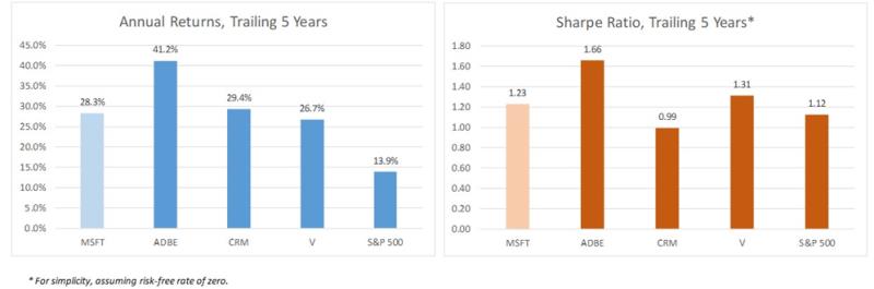下图对比了过去五年中,部分重订阅模式公司和标普500指数的年回报率和用于衡量风险调整后收益的夏普比率。