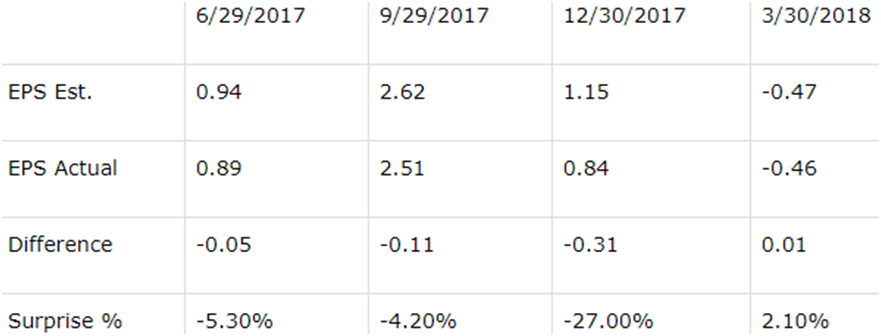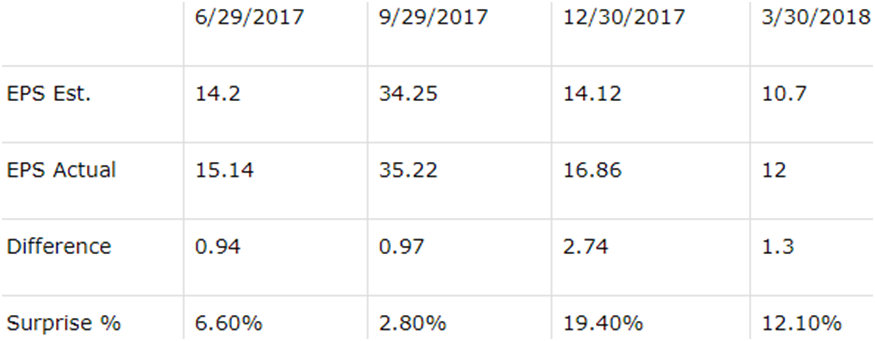 从下表可以看出,Booking公司的历史盈利水平,其实际EPS在最近4个季度全部都超过预期,尤其是在2017年12月财季EPS超过预期2.74美元。