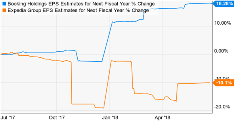 相反,Expedia则仅仅在最近一个财季超过预期,其业绩没有像Booking这样具有打破预期的连续性。