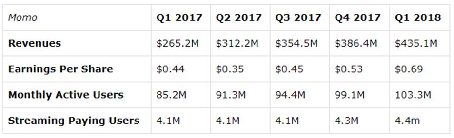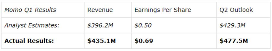 上个月,Momo轻而易举地超过了华尔街的顶线和底线,收获了另一个创纪录的季度。该公司收入创纪录,同比增长64%,达到4.351亿美元,分析师预计营收约为3.962亿美元。公司三月份给出的Q1业绩指引为46-52%之间,因此也是轻松完成。