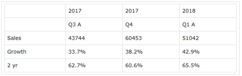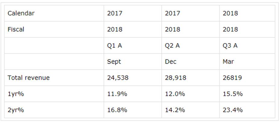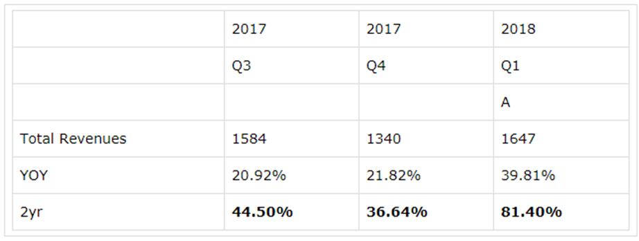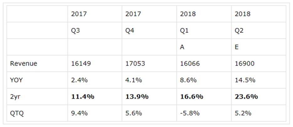 “英特尔预计第二季度的收入将创历史新高,收入约为169亿美元,非GAAP每股收益约为0.99美元。随着以数据为中心的收入加速增长,公司将在上半年取得良好开局,预计2018年又会是创纪录的一年。“