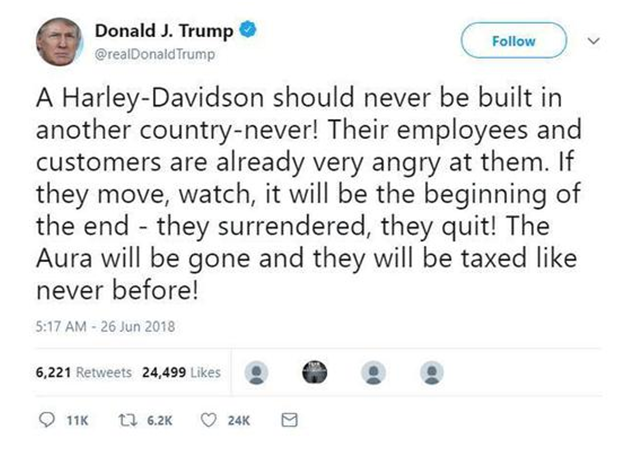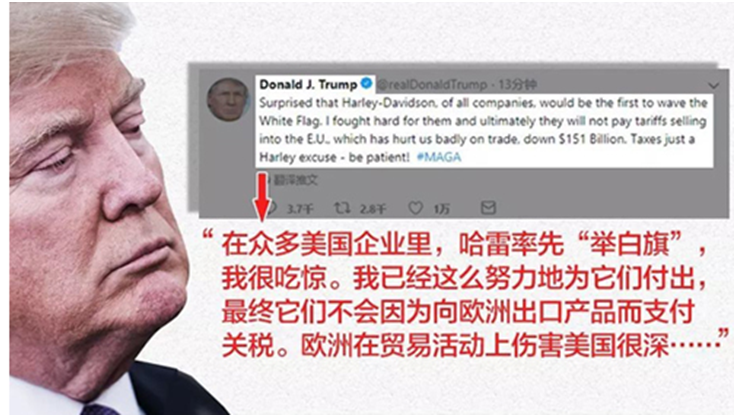 上台之初,曾被特朗普特意“栽培”的哈雷,竟然是第一家“投降”的美国知名大企业;曾经公开强调哈雷是“美国制造”的榜样,是“美国货”的代表,如今却第一个“举白旗”,无怪特朗普很快就在推特上怒斥痛批,哈雷欺骗了他的感情。