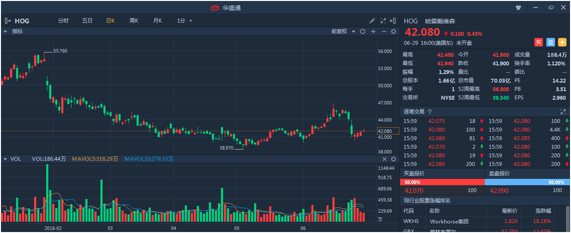 遭到特朗普炮轰的哈雷,公司股价也是接连两天跳水,在6月22日和6月25日分别跳水2.28%和5.97%。