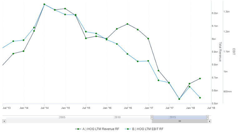 由于美国“婴儿潮”一代的衰老和目前的年轻人对大型摩托车的兴趣下降,以及哈雷自身居高不下的成本,导致公司产品缺乏降价空间,市场份额在过去的五年里不断下降,其最大的竞争对手Polar Industry(NYSE:PII)不断侵蚀公司的市场份额。