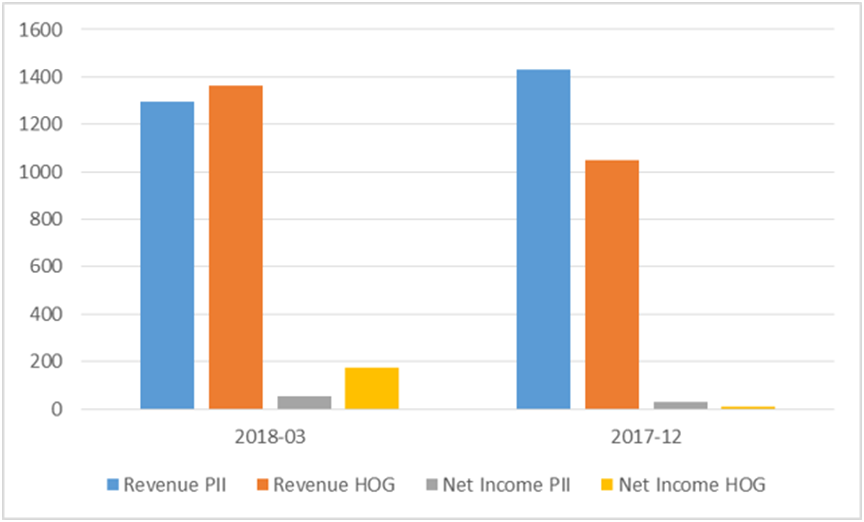 得益于产品本身与众不同的特点,在顾客群体中拥有积极的反应,最终,哈雷在与Pollar Industry的战役中打了一场漂亮的“翻身仗”。通过下图可以看出,公司在2018年营收和净收入大幅提高,并反超竞争对手。