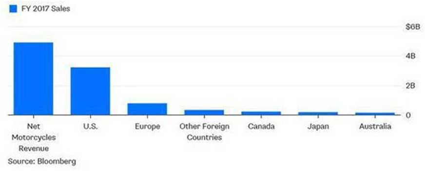 美国总统特朗普在今年3月决定对欧盟发起贸易战,对来自欧盟的钢铁和铝制品征收制裁性关税,欧盟则对美国展开关税反击,其中一个重点就是提高对从美国出口到欧盟的“哈雷摩托车”,关税从之前的6%提升到了31%,直接导致“哈雷”在欧盟的销售成本每辆多出了2200美元;预计合计将高达1亿美元。这对于近些年在美国业务持续下滑,但在欧洲业务进展顺利的哈雷,无疑是一个重大打击。