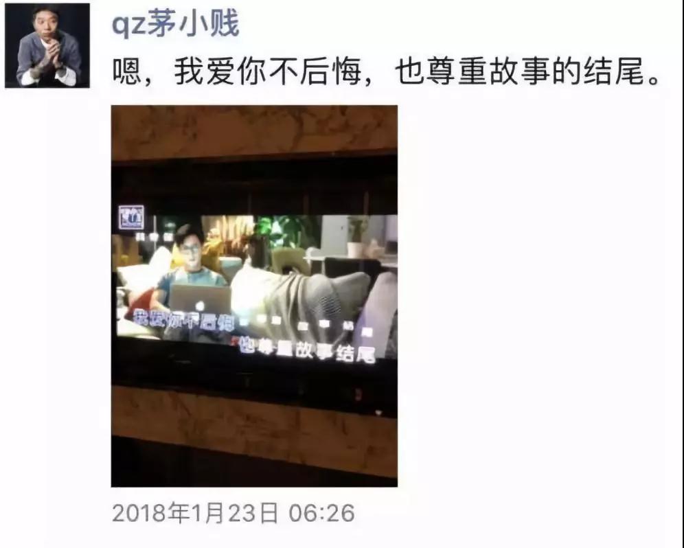“我爱你不后悔,也尊重故事的结尾。”这是定格在茅侃侃微信的最新一条朋友圈,发自2018年1月23日。