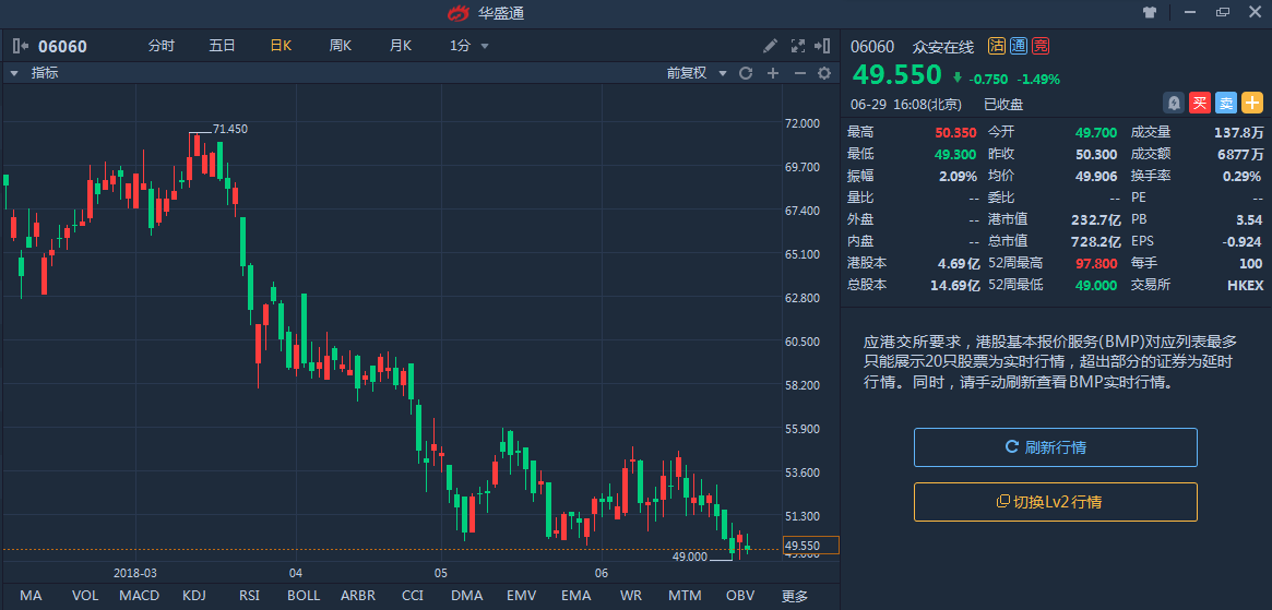 资料来源:华盛证券,众安在线已破59.7元招股价,跌幅为15%