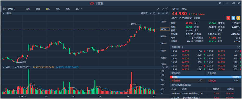 差点儿凉凉的推特,由于总统光环的加持,成为美国新政发布的第一道出口,更是成为特朗普治国之利器,从对内税收政策,到对外国际关系,推特在一道道圣谕推动下,业绩开始好转,股价更是一路上涨,到达45美元的水平。