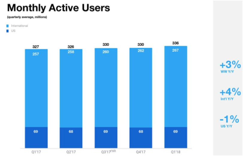 虽然公司单位用户收入接近10美元,但是相比于Facebook单位用户收入为25美元,推特仍需努力增加用户数量,提高单位用户收入。目前公司的日活用有所上升,但月活用户数上升趋势不够明显,截止2018年第一季度为3.36亿人次。