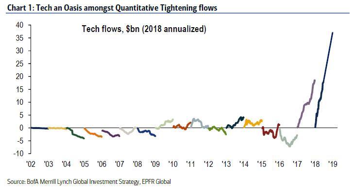吸纳这些资金的地方之一就是科技基金,今年的净流入量已达到370亿美元。这是去年的两倍,是过去十五年中任何一年的十倍。