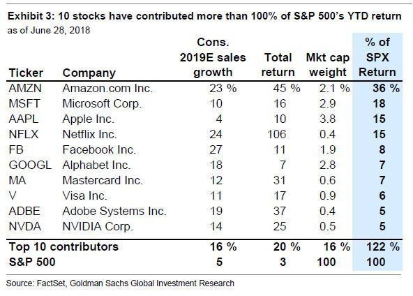 因此,这些基金主要把资金用来购买全球科技股股票,从而如我们所预期的那样,推动了这些公司的股价上涨。它还具有推高市值的效果,而标准普尔500指数是市值加权指数,大公司的比例权重更大。正如高盛的David Kostin所言,结果导致今年四家公司(亚马逊,苹果,Netflix和微软)贡献了该指数84%的上涨。