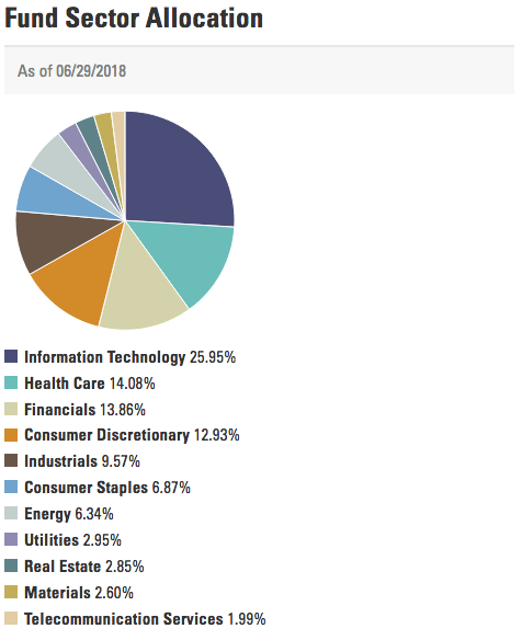 另外,从上图可以看出今年迄今为止,10家公司(其中8家是科技公司)贡献了标准普尔500指数122%的上涨。换句话说,如果不是这10家公司,该指数在2018年将大幅下跌。而且8家科技公司这个权重已经非常大,以下是SPDR标准普尔500指数ETF当前行业权重: