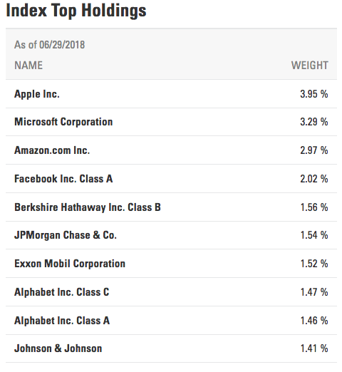 很明显,信息技术占该指数的一大部分,几乎是医疗保健和金融部门(分别是第二和第三大组成成分)的占比之和,或许更有说服力的是ETF的十大单一持股: