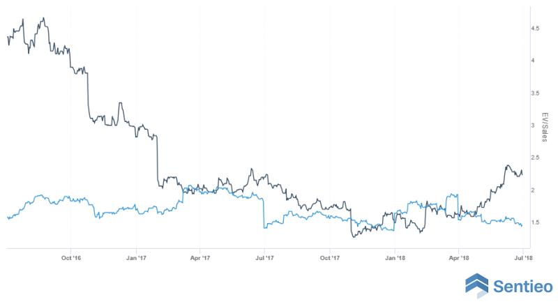 从目前估值来看,安德玛欠缺吸引力。市场给予安德玛的估值较高,公司目前的市销率高于阿迪达斯(下文简称阿迪)。市销率是一项相对估值指标,安德玛较高的市销率可以看做是对市场存在潜在非理性行为的警示。如下图所示,安德玛当前市销率超过2.3,而阿迪达斯的市销率仅为1.5。